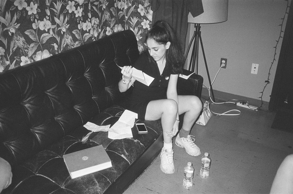We head back to the Rough Trade green room where Samia becomes very quiet. She tells me she usually uses pre-show time to get really focused, which to her is having the mentality of going “straight for the throat”. By this she means showing no compromise in the energy she wants to emit and the performance she wants to give. I see folded papers and envelopes next to her which she tells me are fan letters. The serious expression on her face reflects how humbled she feels and the importance her fans hold in her life. These are the people Samia refuses to disappoint and the reason why she can never compromise.