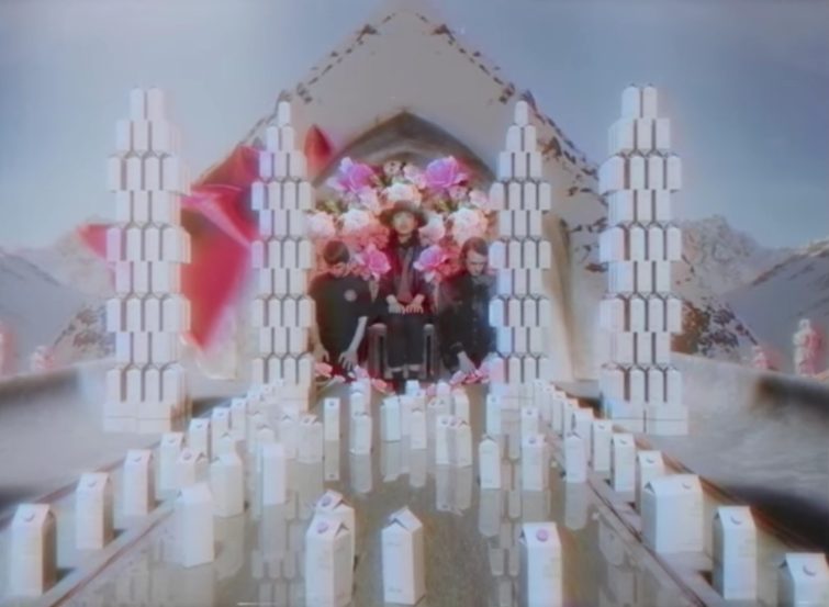As milk is manically consumed outside of its normal context – in a bathtub from a wine bottle, out of the jug while sitting on the floor next to a feline while an animated milk carton watches from the counter – bodies become distorted and bulky TVs show nonsensical images. Milk, normally meant to nourish the body, becomes a vice, and ultimately the tears that run down the band’s face.