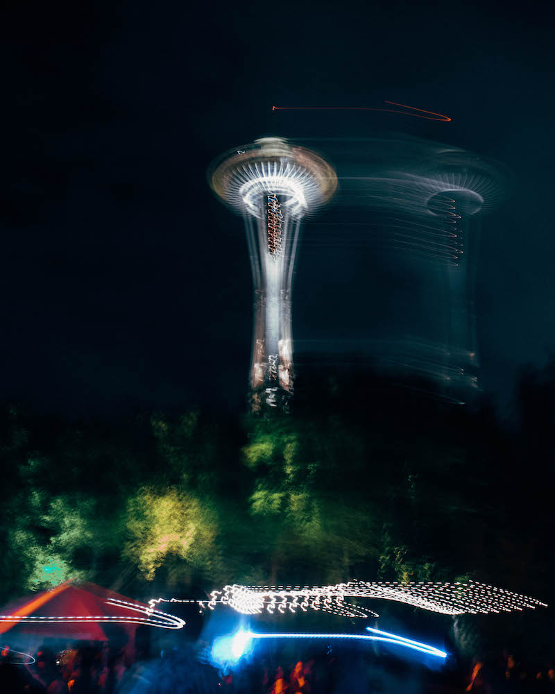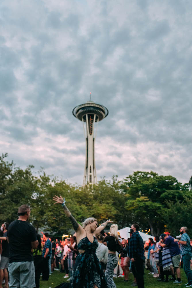 With the space needle looming over head and the bass reverberating throughout the grounds, I could hear Travis Thompson in the midst of his set when I arrived. It was still light out and fans were jumping along in step with his lyrics, arms flying in the air in the pit, and further out spaced out on the grass were tumbling, twirling, dancing, and just having a good time. There’s a lot of pressure for festivals to live up to the hype when there’s money and time put into it from the ticket holder’s perspective, but everyone seemed to be having a genuinely amazing time being able to celebrate with their friends outside in the company of live music. There was a beauty in the lack of overcrowding as well. The festival had made a statement that they were selling fewer tickets in an effort to give people more space for social distancing. The lawn felt full and lively, but you could dance your heart out without worrying you’d smack someone in the face which was one of the most fun parts of the overall environment they created.