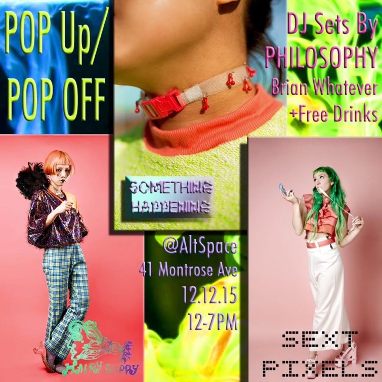 Alt Space is hosting POP UP/POP OFF on December 12 from 12-7PM for a pop up market with some of our favorite designers Hairy Guppy, Something Happening, and Sext Pixels. Hang out, look at rad new styles by these local creative and listen to DJ sets by Brian Whatever and Philosophy. See you there!