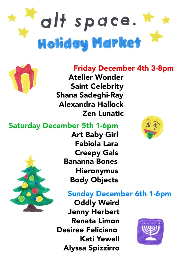 Join us at Alt Space for our holiday markets from December 4 through 6 (times differ per day). Some of our favorite local venders will be hanging with us, so support small business and do holiday shopping with us!
