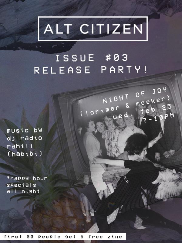 Tonight, we celebrate! All of our love and hard work has paid off with Issue #3, and we’re hosting a release party tonight at Night of Joy, a cozy little joint tucked away in Williamsburg.
