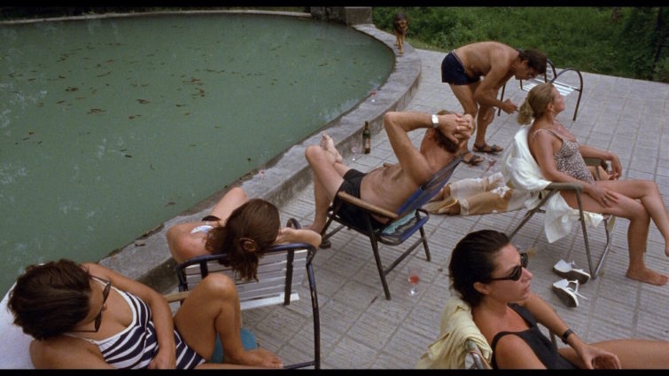 The opening scene starts off from a lower perspective— like that of a young child, peering into the taut, tan, wrinkled & dehydrated bodies of a group of lethargic adults lounging by a filthy pool. They drag & scrape metal lounge chairs. Then the camera zooms out to Mecha (Graciela Borges) the matriarch of the household in the mountains, as wine is poured and ice clinks against glass, her movements are slow and onerous, she slips and falls on to the pavement, the wine glasses strike her chest. The shattering sound and the tumbling of the glass, alert the children. Immediately they get up from their beds. While Mecha’s partner Gregario (Martin Adjemian) a more severe alcoholic, casually tells Mecha to get up, unaware that she is bleeding. Their extreme lethargy is a monster that consumes the adults in the film.