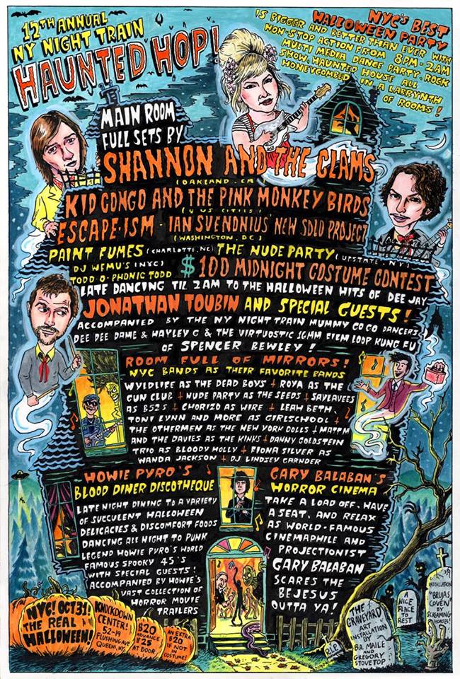 You’re in for a scare! Beloved NY Night Train DJ Jonathan Toubin is throwing a multimedia Halloween dance party at the Knockdown Center this Tuesday 31st (aka HALLOWEEN). The spooktacular line-up include Shannon and The Clams, Kid Congo (The Cramps, Gun Club), Ian Svenonius (Chain and The Gang, Make-Up) and The Nude Party. Plus, a haunted house honeycombed in a labyrinth of non-stop party rooms! Dress up if you dare!