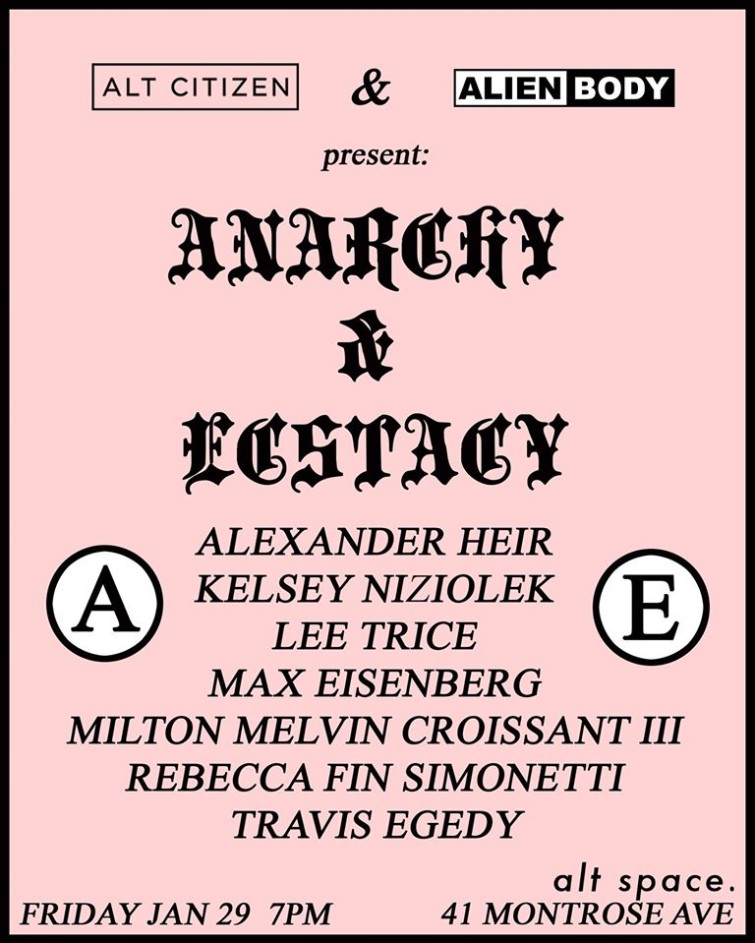 Alt Space presents Anarchy and Ecstasy, a one night only group show curated by Brooklyn enigma and multimedia artist Pictureplane, featuring work by artists Alexander Heir, Kelsey Niziolek, Lee Trice, Max Eisenberg, Milton Melvin Croissant III, Rebecca Fin Simonetti, and Travis Egedy. This will be the last show ever at our Montrose location before we head off on a major city tour for 5 weeks to promote the shop and the latest issue of Alt Citizen – which is out this February. Come wish the gang safe travels and say bye to the space that hosted a year of epic events.