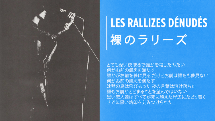 En 1967 Les Rallizes Dénudés era una banda de psych doom de Kioto creada por Takashi Mizutani un existencialista y aficionado de The Velvet Underground y Bob Dylan entre otros. Su sonido era explosivo, melódico y muchas veces sexy con un toque de misticismo y mucho reverb.