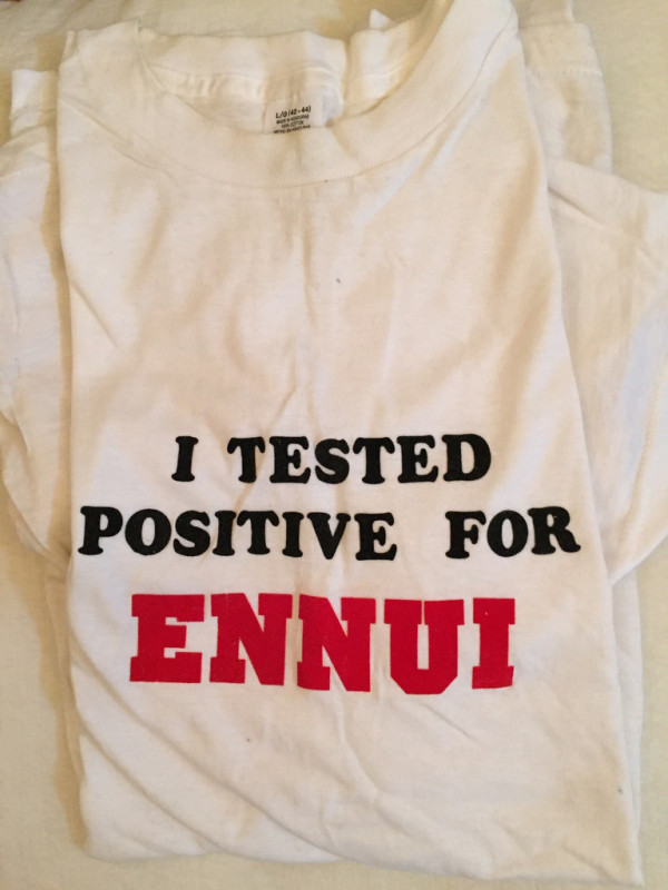 In another take on the idea of transactions, this time in the social sense, Garner also showed a series of customized statement T-shirts that seemed rooted in the early 2000s trend of wearing your opinion on your chest. Appropriately hung in one corner of the room, the shirts featured statements like “I Tested Positive for Ennui”, “What’s Your Favorite Artificial Flavor?”, and “Fun Sucks.” If you listened closely enough, you could hear the Daria theme song playing quietly in the background (well, not really — maybe just in your head).