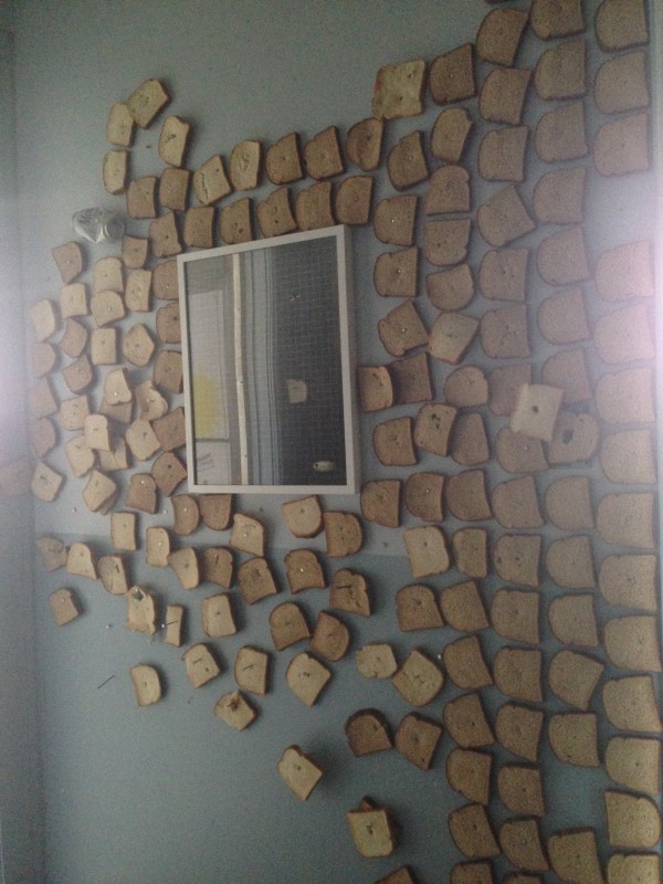 However, the shredded money was only the beginning. After exploring a room filled with what appeared to be rudimentary children’s paintings and a coffee fountain, visitors can venture deeper into Yellin’s space, finding themselves in a narrow hallway with bread covering every surface, an installation called “Hallway of Christ.” Aside from the bread nailed to the wall, unopened loaves littered the hallway, as did pieces of bread that people tracked in and out with their shoes. In fact, everywhere you stood in Yellin’s space, you were standing in something that probably shouldn’t have been there. This opened into a wood-paneled hell that, to me, resembled the waiting room in a mechanic’s shop that time had forgotten. Whereas many artists made an effort to find the beauty in their ravaged gallery spaces, Yellin thoroughly embraced (and added to) 50+ years worth of grime.