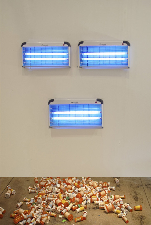 For artist Jo Shane, the bright sunlight of the mid-March afternoon provided a heartbreaking contrast to work reflecting 30 years spent on antidepressants. Whereas many artists were following the theme of Transactions, Shane seemed to be doing the opposite – highlighting her struggle to perform transactions that may have come so easily to her peers. In her installation “Autobiography/All Of The Psychopharmaceuticals Prescribed 1984 – 2014,” 30 years of prescription drug packaging lay on the floor in front of three bug zappers, as if she were going towards the light and was abruptly knocked out of it over and over again.